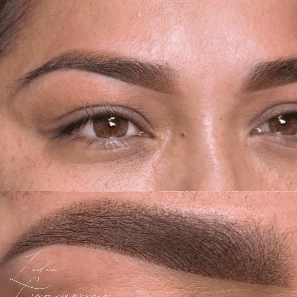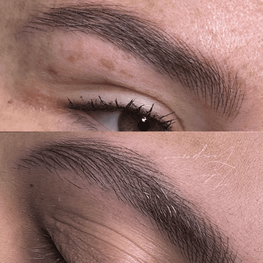 Técnica de retexturización de la ceja. Efecto “pelusilla” cuando cura. Al contrario de lo que se dice del sombreado, es la técnica menos invasiva y más sutil de las que realizo. Es simplemente un pixelado en la ceja natural, que ayuda a dar un aspecto de más densidad.